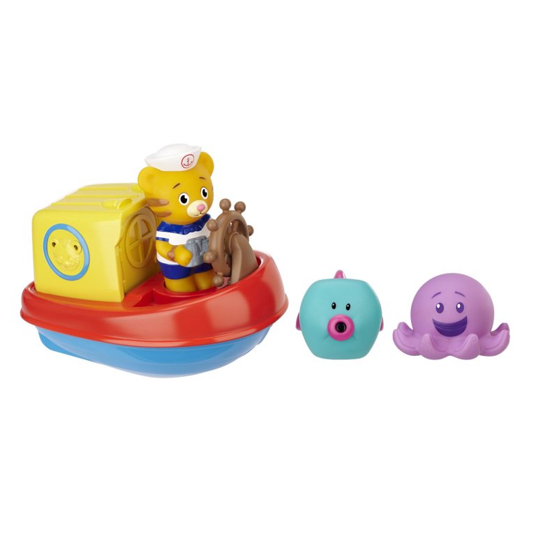 Daniel Tiger loves to play with his toy boat and octopus water squirter.